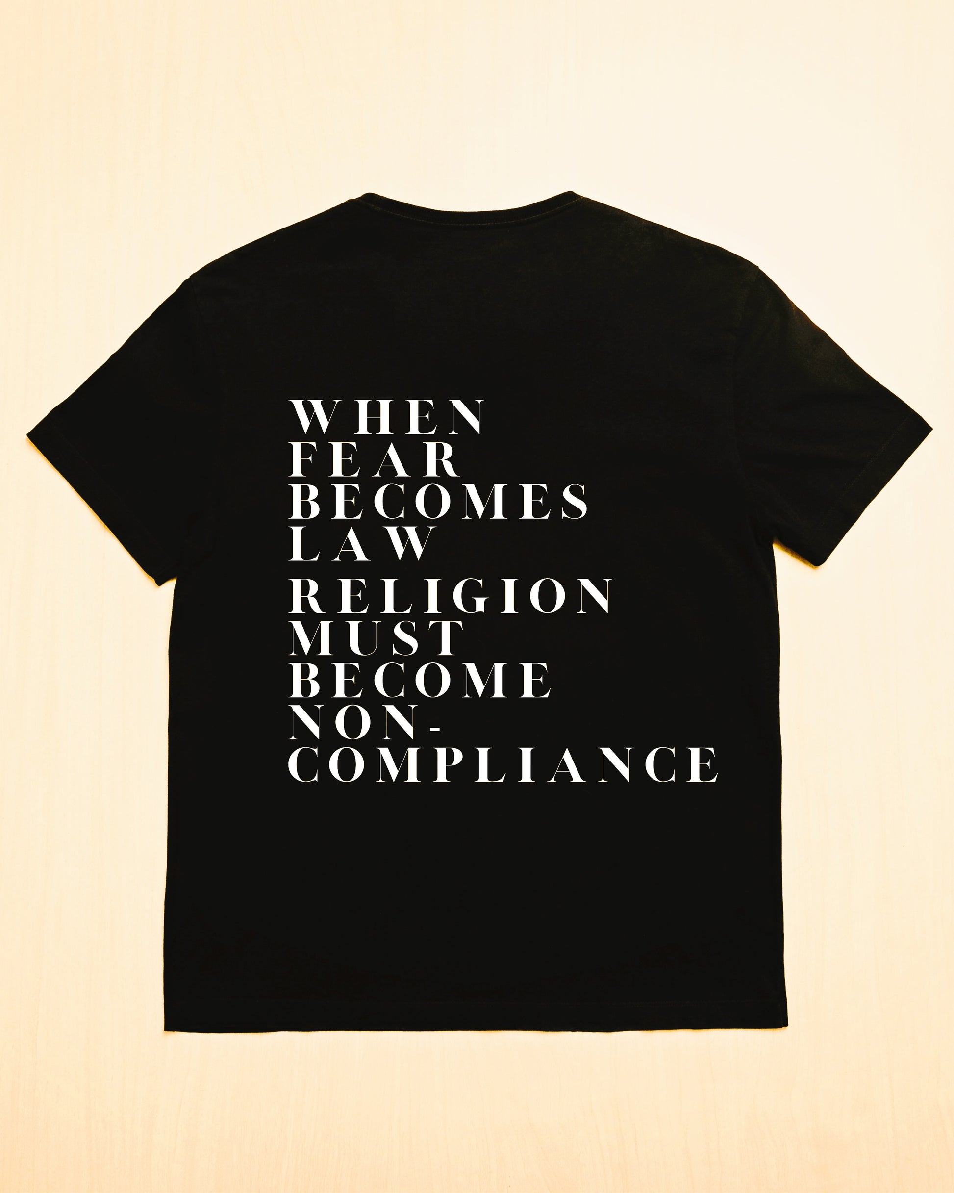 White Text: "WHEN FEAR BECOMES LAW RELIGION MUST BECOME NON COMPLIANCE"